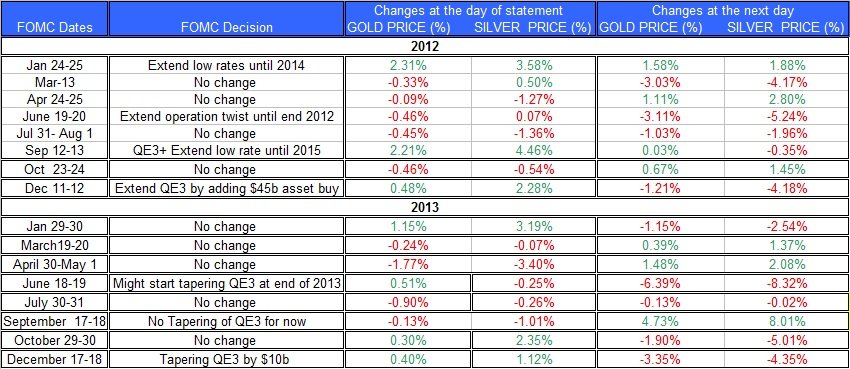 The table below presents the changes in precious metals prices during the day the FOMC makes its announcement and the following day during 2012 and 2013.