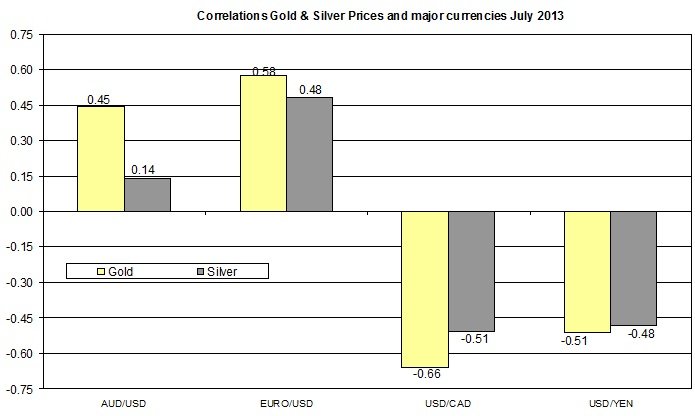 The Euro/ USD currency pair also bounced back on Thursday by 0.58% to 1.3277. During July, the Euro/USD increased by 2.05%. Further, other currencies such as the Aussie dollar and Japanese yen also appreciated yesterday against the U.S dollar by 0.92% and 0.98%, respectively. These changes may have contributed to the recent rally of commodities prices. Moreover, if this trend will continue, it may further pull up gold and silver rates. The chart below shows the strong linear correlations among precious metals prices and leading currency pairs.
