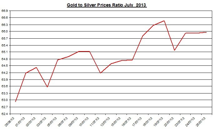 The ratio between the two precious metals edged up on Thursday to 65.96. During July, the ratio rose by 4.83% as gold slightly out-performed silver.