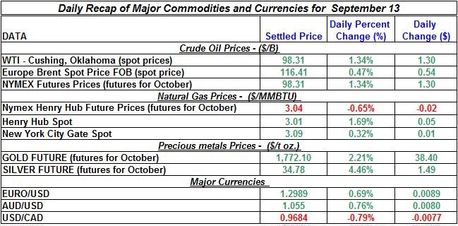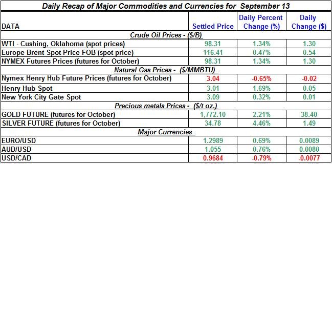 Here is a summary of the daily changes in precious metals and energy commodities for September 13th, 2012:
