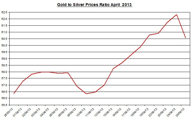 Gold & silver outlook 2013  April 26The ratio between the two precious metals sharply fell on Thursday to 60.56. During the month, the ratio rose by 7.43% as gold out-performed silver.