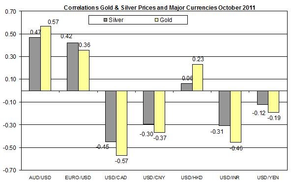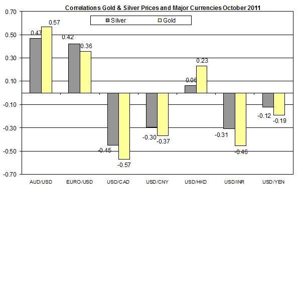 The Euro to U.S Dollar exchange rate sharply increased yesterday by 2.04% to reach 1.4189; other currencies also were traded sharply up against the USD including CAD, and AUD. It seems that the effect of the sharp gains in the “risk currencies” (i.e. AUD, Euro and CAD) was strong in helping push gold and silver prices up. The chart below shows the strong correlations among the gold and silver prices daily percent changes in the daily percent changes of major exchange rates. If said currencies will continue their rally today they might add to the gains in gold and silver prices.