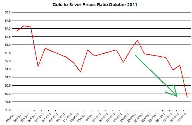 The ratio between gold and silver prices sharply fell on Thursday, October 27th to 49.78. During October, silver price inclined by a slightly larger rate than gold price as the ratio slipped by 7.7%.