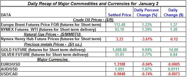 Here is a summary of the daily developments of precious metals and energy commodities for January 2nd, 2013:
