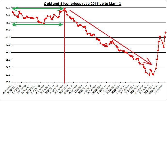 As May will progress if there won’t be any new breaking news that will affect silver and gold price we should likely to see the recent correction to remain and keep current ratio of gold to silver at its new range of 42 to 46, the range back in February 2011.