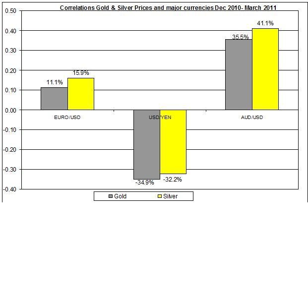 - Australian dollar affect: there was also a rally for the Australian dollar in the past couple of months. This fact coincides with the rally of silver prices as their average price rose by 8.5% in February and 15.1% in March. The AUD has a stronger correlation with silver than with gold (see graph below). I speculate that these two factors might indicate a relation between silver and AUD, especially since Australia is a leading country in exporting metals including silver.