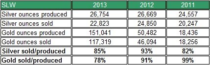 - Higher delay in delivery: In the past year, the drop in prices of gold and silver may have partly been responsible for the rise in delay of precious metals delivery. The new projects that were implemented also resulted in delays in deliveries. As of the last quarter of 2013, the amount of precious metals produced and not yet delivered reached 6.4 million silver equivalent ounces — the highest level in recent years. If the price of silver remain low, the amount of bullion produced and not yet delivered is likely to remain high. The table below shows the ratio of silver and gold sold vs. produced in the past several years. As you can see the ratios of both gold and silver declined in the past year. If the ratios continue to fall, the company’s revenue will decline in the following quarters.