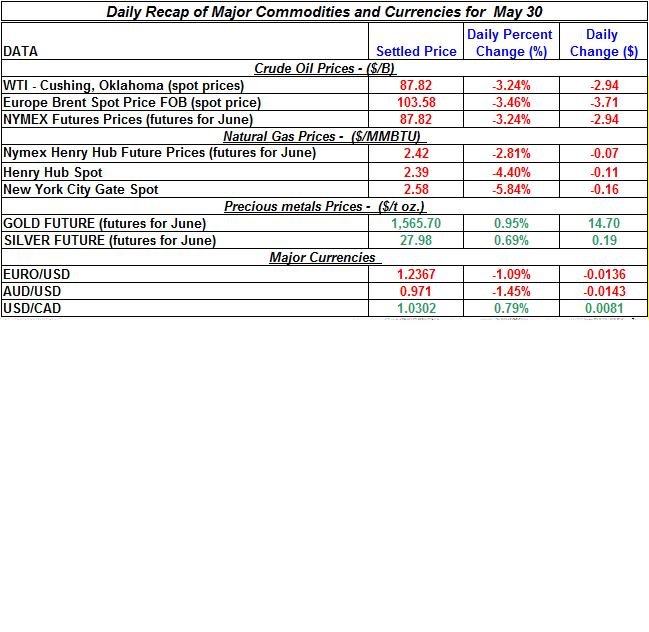 Here is a summary of the daily changes in precious metals and energy commodities for May 30th, 2012: