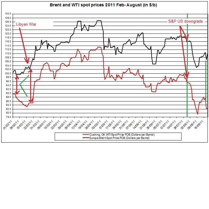 The chart below presents the price development of WTI spot oil and Brent oil during February to August. It shows the price hike in Brent and WTI oil prices as the Libyan war started and the sharp fall in oil prices at the beginning of August when S&P downgraded US credit rating.