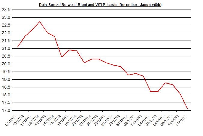 The difference between Brent oil and WTI spot oil contracted again during last week at the range between $17 and $19 per barrel. During the month the premium fell by 11.5%.