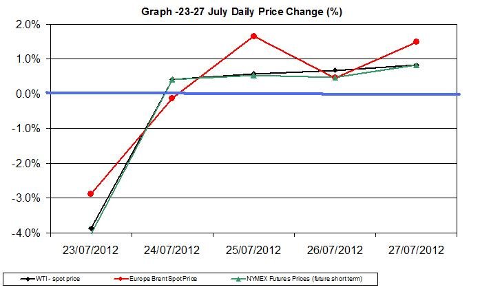 In the following charts (for the week ending on July 27th) are the daily shifts in WTI spot oil, NYMEX Future (short term delivery) and Brent oil: