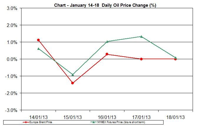 In the following charts (for the week ending on January 18th) are the daily changes in NYMEX WTI future (short term delivery) and Brent oil: