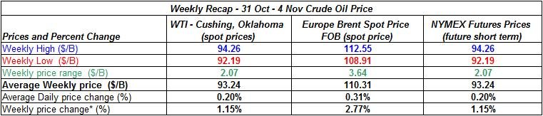 Here is a review of the price changes during last week (October 31st to November 4th) of crude oil (Brent oil and WTI), and a summary of the recent EIA crude oil and petroleum stockpiles report: