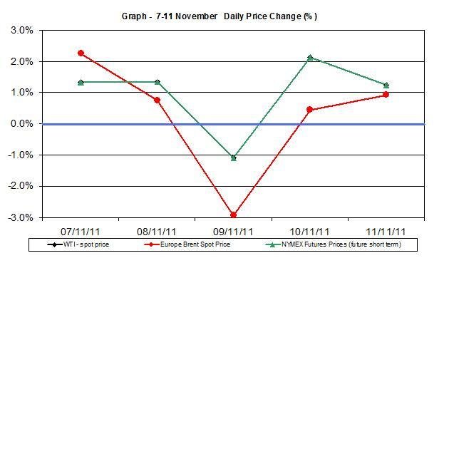 The following chart demonstrate last week’s (for the week ending on November 11th) changes in trends of WTI spot oil price, NYMEX Futures Prices (December delivery) and Europe Brent spot oil price: