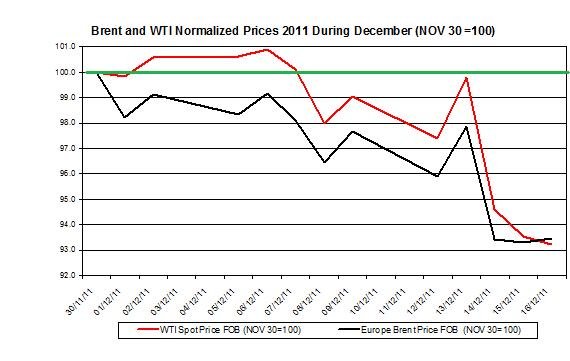 Difference between Brent and WTI crude spot oil price forecast 2011 December 19Despite the ongoing sharp shifts in the premium of Brent oil over WTI oil prices, the correlation between the daily percent changes of Brent oil price and WTI oil price sharply rose during December and reached its highest monthly correlation in 2011. This means that the relation between WTI and Brent oil prices has tighten, and thus might indicate that global and financial news (such as the EU debt crisis updates and FOMC meeting news) affected energy prices more than regional news, which are related to crude oil market (such as changes in U.S.’s crude oil stockpiles).