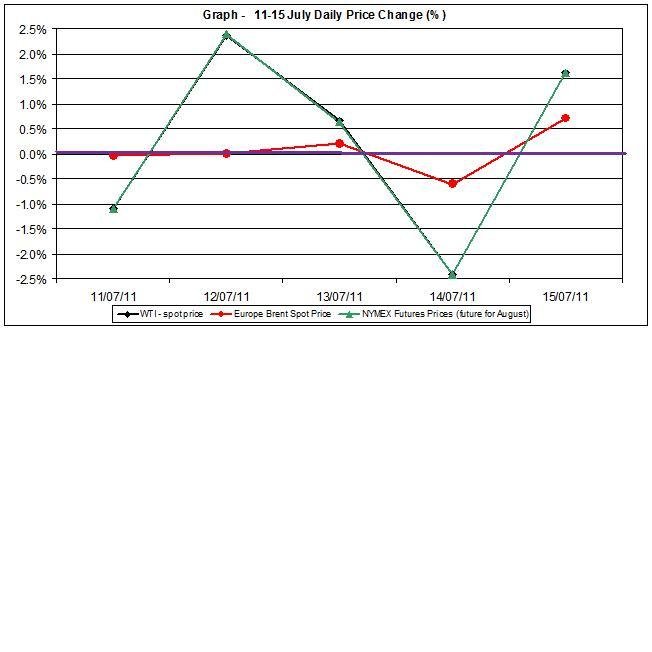 The following chart shows last week’s trend of WTI spot oil price, NYMEX Futures Prices (August delivery) and Europe Brent spot oil price: