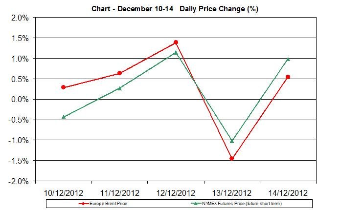 In the following charts (for the week ending on December 14th) are the daily changes in NYMEX WTI future (short term delivery) and Brent oil: