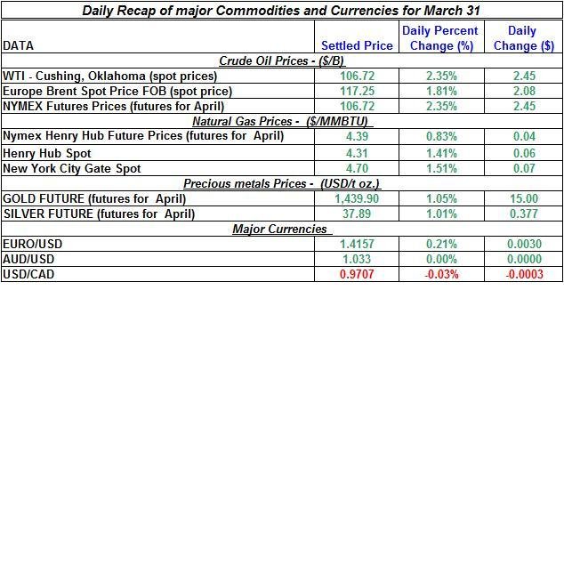 Here is a short summary of the price changes in major energy commodities and precious metals for March 31st: