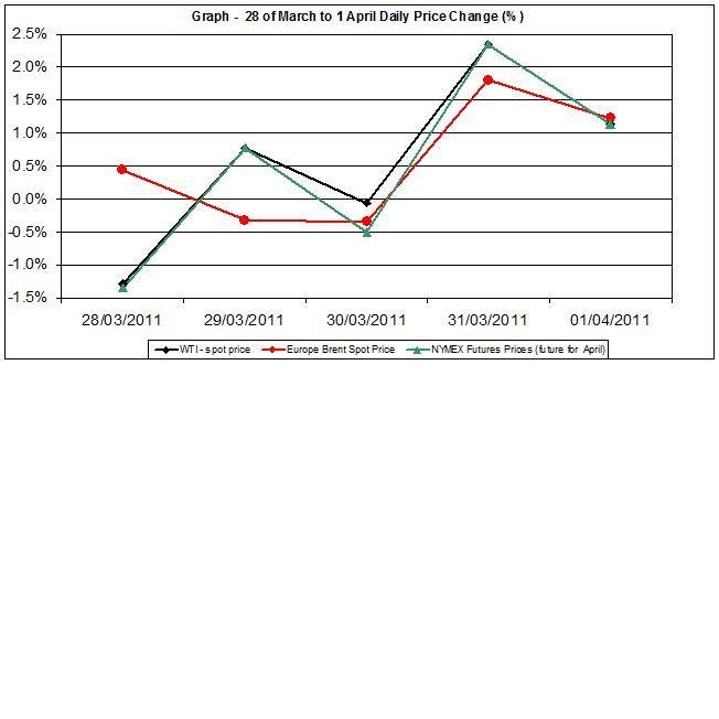 The following charts show the daily changes of WTI spot price, NYMEX Futures Prices (April delivery) and Europe Brent spot price during last week: