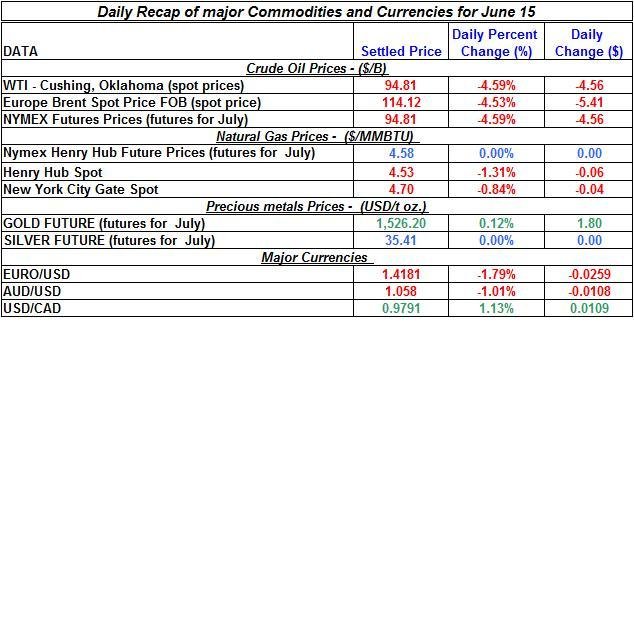 Here is a summary of the price movements of precious metals and energy commodities for June 15h: