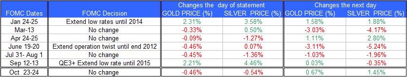 The table below shows the bullion markets’ reactions to the news of the FOMC during 2012. As seen, in the September FOMC meeting bullion rates hiked on the day of the announcement. This time this decision is likely to also pull sharply up the prices of gold and silver at least on today.