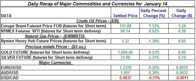 Here is a summary of the daily developments of precious metals and energy commodities for January 14th, 2013: