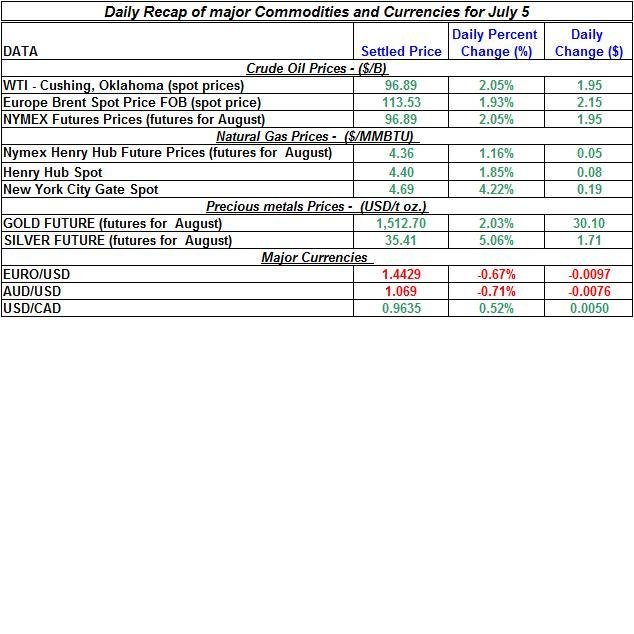 Here is a summary of the price movements of precious metals and energy commodities for July 5th: