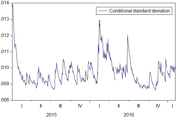 The volatility of gold has picked up since the U.S. elections as indicated in the chart below of the GARCH(1,1) of gold between 2015 and 2017.