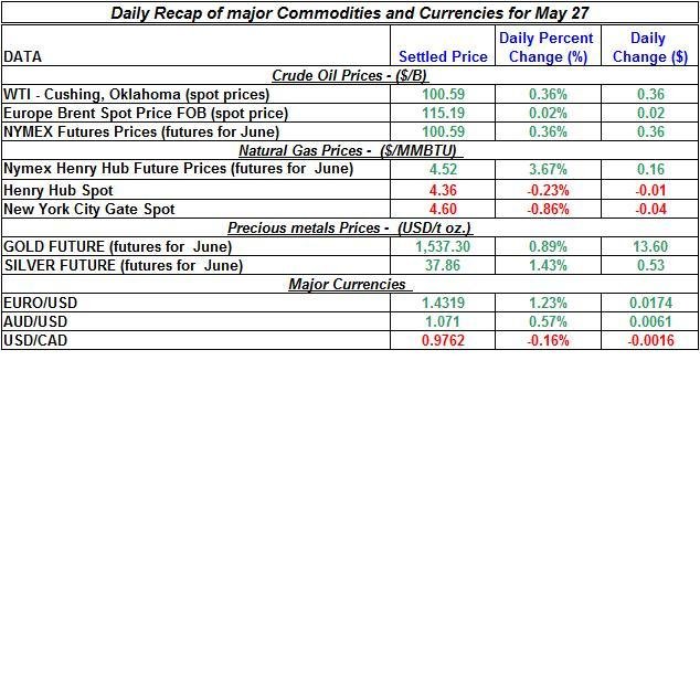 Here is a summary of the main price changes in energy commodities and precious metals for May 27th: