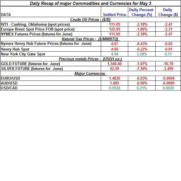 Here is a summary of the changes in commodities and precious metals for May 3rd: