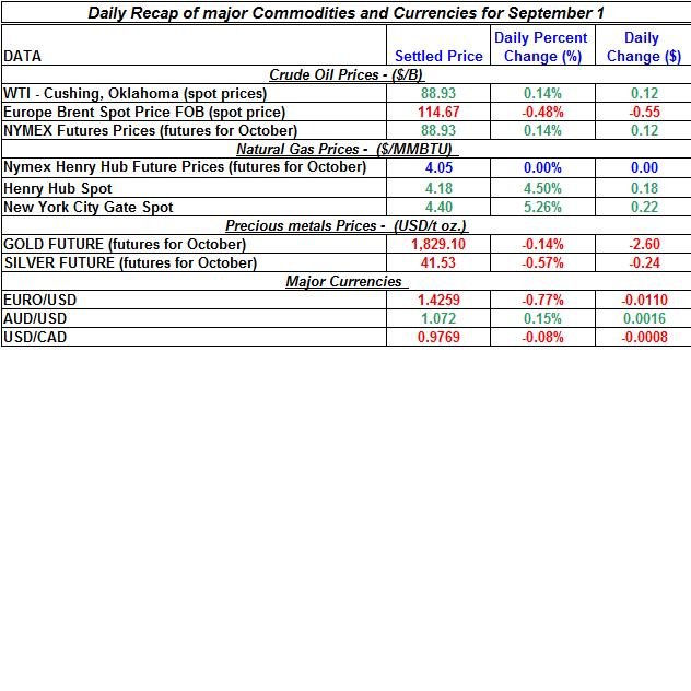 Gold and silver prices started off September with light falls; crude oil prices ended trading yesterday with mixed trend as Brent oil slightly declined, and WTI spot oil increased; natural gas spot price (Henry Hub) continued its rally and sharply inclined yesterday. Here is a summary of the price movements of precious metals and energy commodities for September 1st: