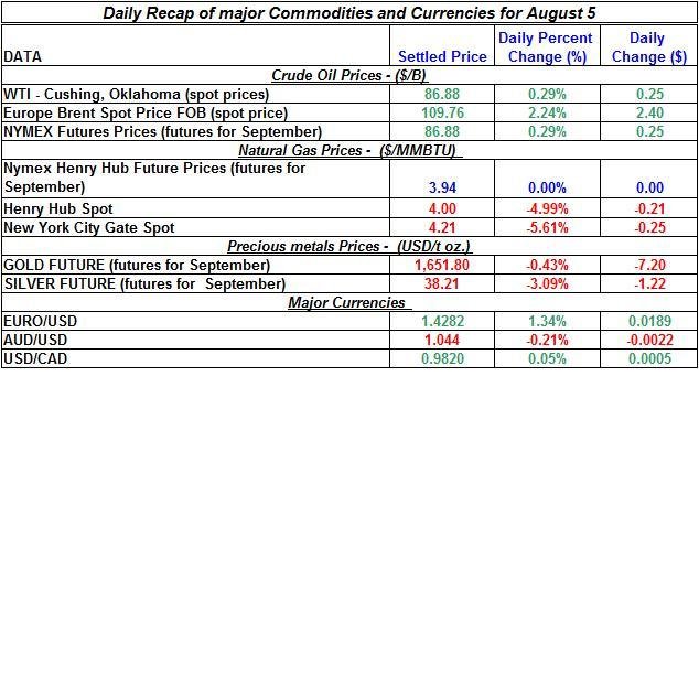 Here is a summary of the price movements of precious metals and energy commodities for August 5th: