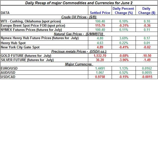 Here is a summary of the main price changes in energy commodities and precious metals for June 2nd: