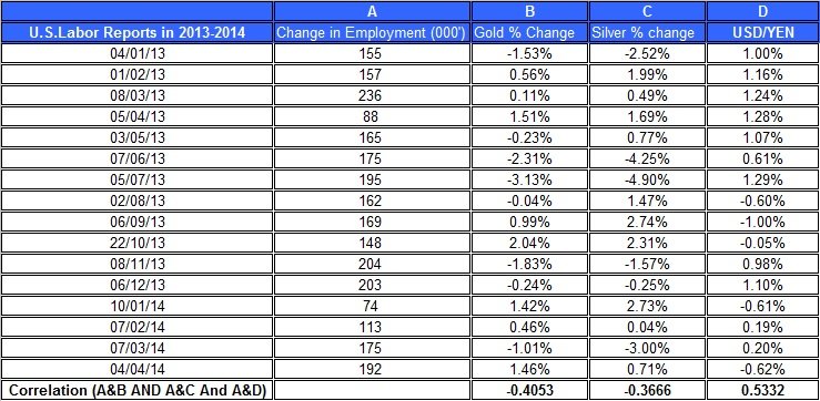 Last week’s NF payroll report showed signs of progress and was inline with ADP estimates, but some people expected better results. This was enough to drag down the prices of precious metals. The table below shows the relation between the number of jobs added each month (not revised) and the changes in precious metals prices.