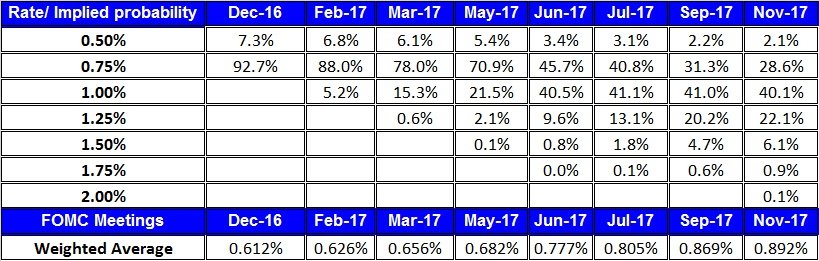 The NFP report showed, yet again, a stable growth in jobs but didn’t present higher growth in wages – only 2.5% compared to 2.8% in the previous report; this is probably one of the main reasons for the modest gain in bullion prices as it slightly reduced the odds of a hike in December: The implied probability slipped to 92.7%. And as you can see in the table below the markets currently expect roughly one more hike in 2017; in comparison, the FOMC predicted two hikes in 2017. Given the recent developments in the markets including the rise in inflation expectations the markets may need to raise these estimates to 2 hikes as the Fed expected.
