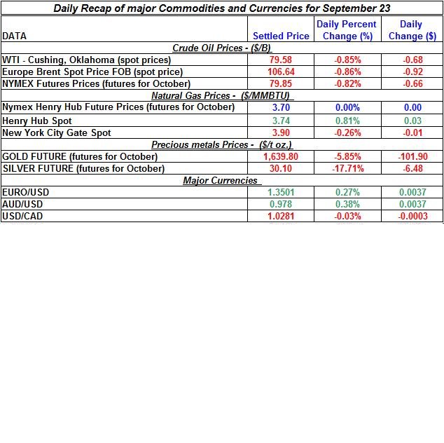 Gold and silver prices closed the week with very dramatic falls; the recent announcement by CME of a raise in margins requirements for gold and silver trading didn’t help precious metals traders. Gold and silver prices suffered the sharpest single day drop since 1983 (according to Bloomberg). Crude oil prices slightly declined yesterday; natural gas prices (Henry Hub) had a mixed trend. Here is a summary of the price movements of precious metals and energy commodities for September 23rd:
