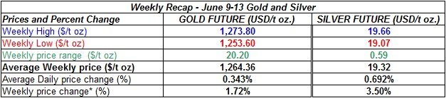 The bullion market rallied again for the second consecutive week. The surge in violence in parts of Iraq may have contributed to the rise in prices of not only oil but precious metals. This rally may have also been driven by the depreciation of the U.S dollar against the Yen and Canadian dollar. Last week, several U.S reports were mostly positive regarding the progress of the U.S economy: The JOLTS showed an over 7% rise in job opening during April to reach 4.5 million. The PPI inched down by 0.2% in May. Retail sales slightly grew by 0.3% during last month and by 3.4% during the first five months of 2014. Finally, Jobless clams slightly increased by 4K to reach 317K. During last week, gold price rose by 1.72%; silver, by 3.5%.