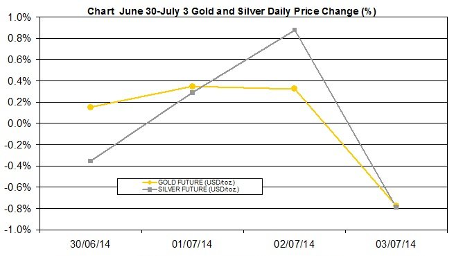 weekly precious metals chart June 30- July 4 2014 percent changeFor further reading: