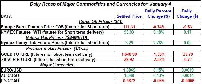 Here is a summary of the daily developments of precious metals and energy commodities for January 4th, 2013: