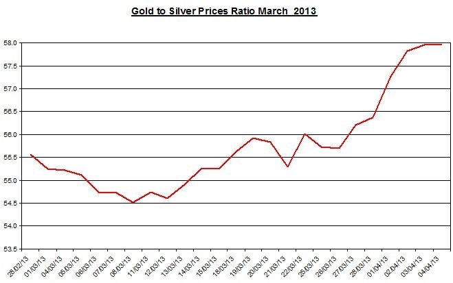 The ratio between the two precious metals inched up again on Thursday to 57.98. During the month, the ratio rose by 2.86% as gold moderately out-performed silver.