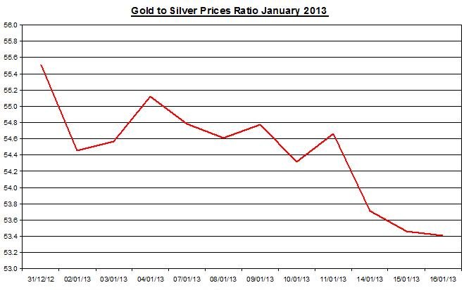 The ratio between the two precious metals declined again on Wednesday to 53.46. During the month the ratio fell by 3.7% as gold under-performed silver.