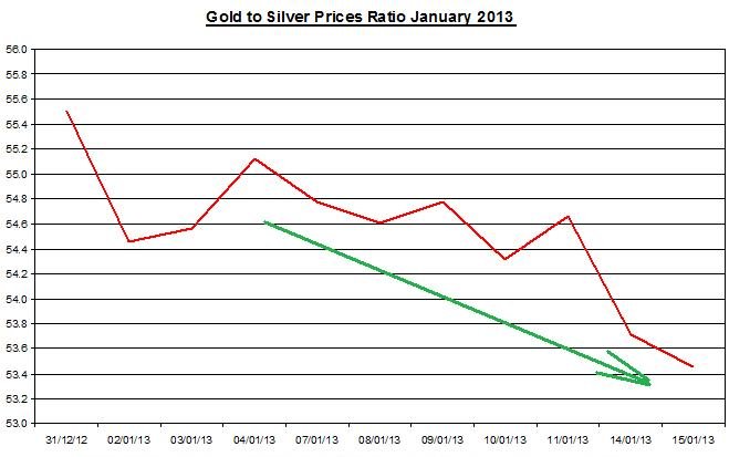 The ratio between the two precious metals declined again on Wednesday to 53.46. During the month the ratio fell by 3.7% as gold under-performed silver.