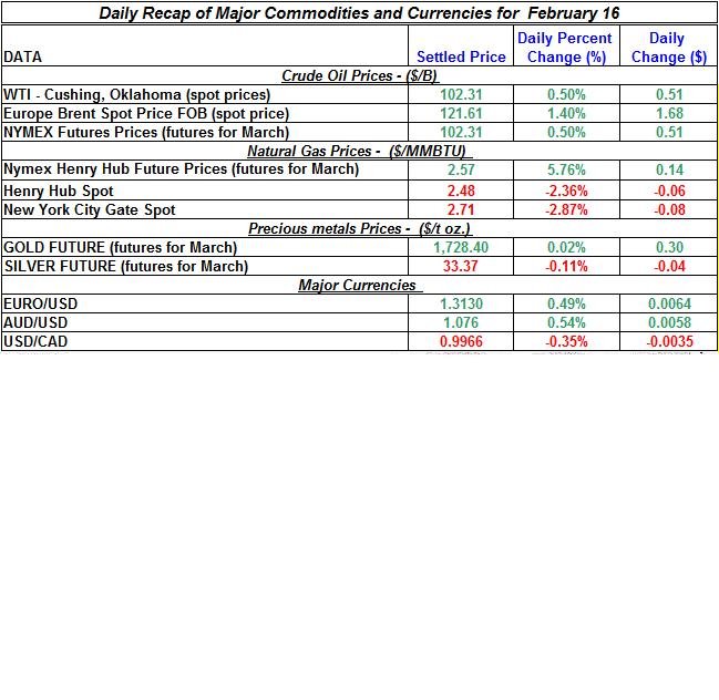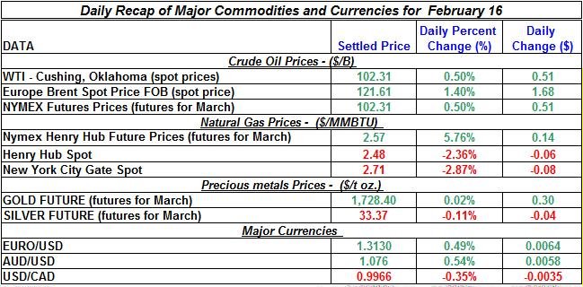 Crude oil prices increased again for the second consecutive day; gold price and silver remained nearly unchanged as gold slightly rose and silver moderately decreased on Thursday. Natural gas prices changed direction and sharply increased. The Euro also shifted and slightly appreciated against the US Dollar; other major currencies (Aussie dollar) also slightly appreciated against the U.S dollar. Here is a summary of the developments of precious metals and energy commodities for February 16th, 2012: