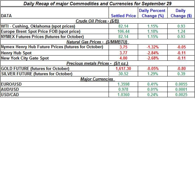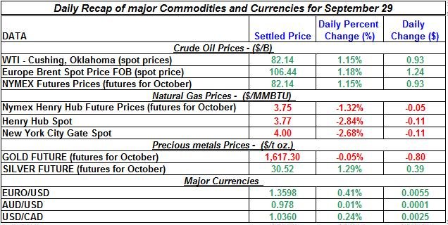 Gold and silver prices slowed down yesterday after they have been having endured turbulent times in recent weeks. Gold price slightly declined, while silver price increased.  Crude oil prices bounced back yesterday and slightly inclined; natural gas prices (Henry Hub) continued their slow descent. Here is a summary of the price movements of precious metals and energy commodities for September 29th: