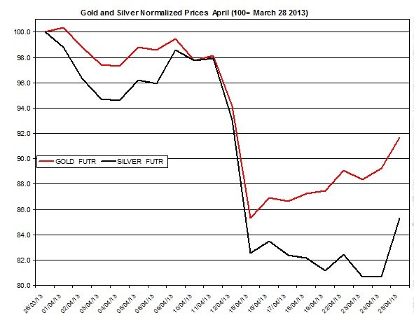 In the chart below are the normalized rates of gold and silver for 2013 (normalized to 100 as of March 28th). The prices of precious metals rallied in recent days.