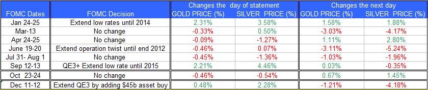 The table below shows the bullion markets’ reactions to the news of the FOMC during 2012. As seen, in the September FOMC meeting bullion rates hiked on the day of the announcement. This time, the prices of gold and silver slightly rose on the day of the announcement but fell the next day. This reaction is similar to the market reaction in June following the Fed’s decision to extend operation twist.