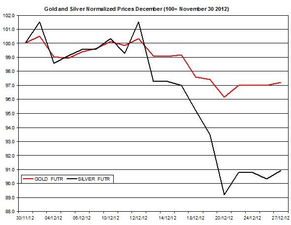 As seen below, the chart presents the developments in the normalized prices of bullion during December (normalized to 100 as of November 30th). In recent weeks, the prices of silver and gold have moderately declined.