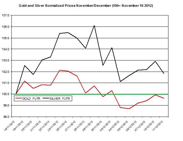 As seen below, the chart shows the changes in the normalized prices of precious metals during recent weeks (normalized to 100 as of November 16th). During recent weeks the price of silver rose while the price of gold remained virtually unchanged.