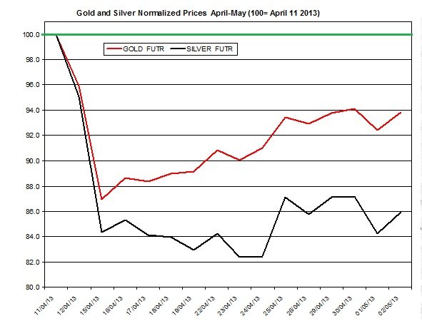 In the chart below are the normalized rates of gold and silver for the past several weeks (normalized to 100 as of April 11th). The prices of gold and silver slowly rallied in recent weeks.