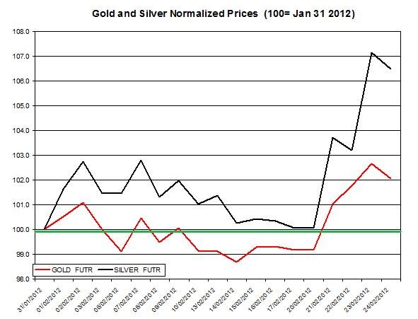 The chart below shows the developments of gold and silver during the month (prices are normalized to January 31st).